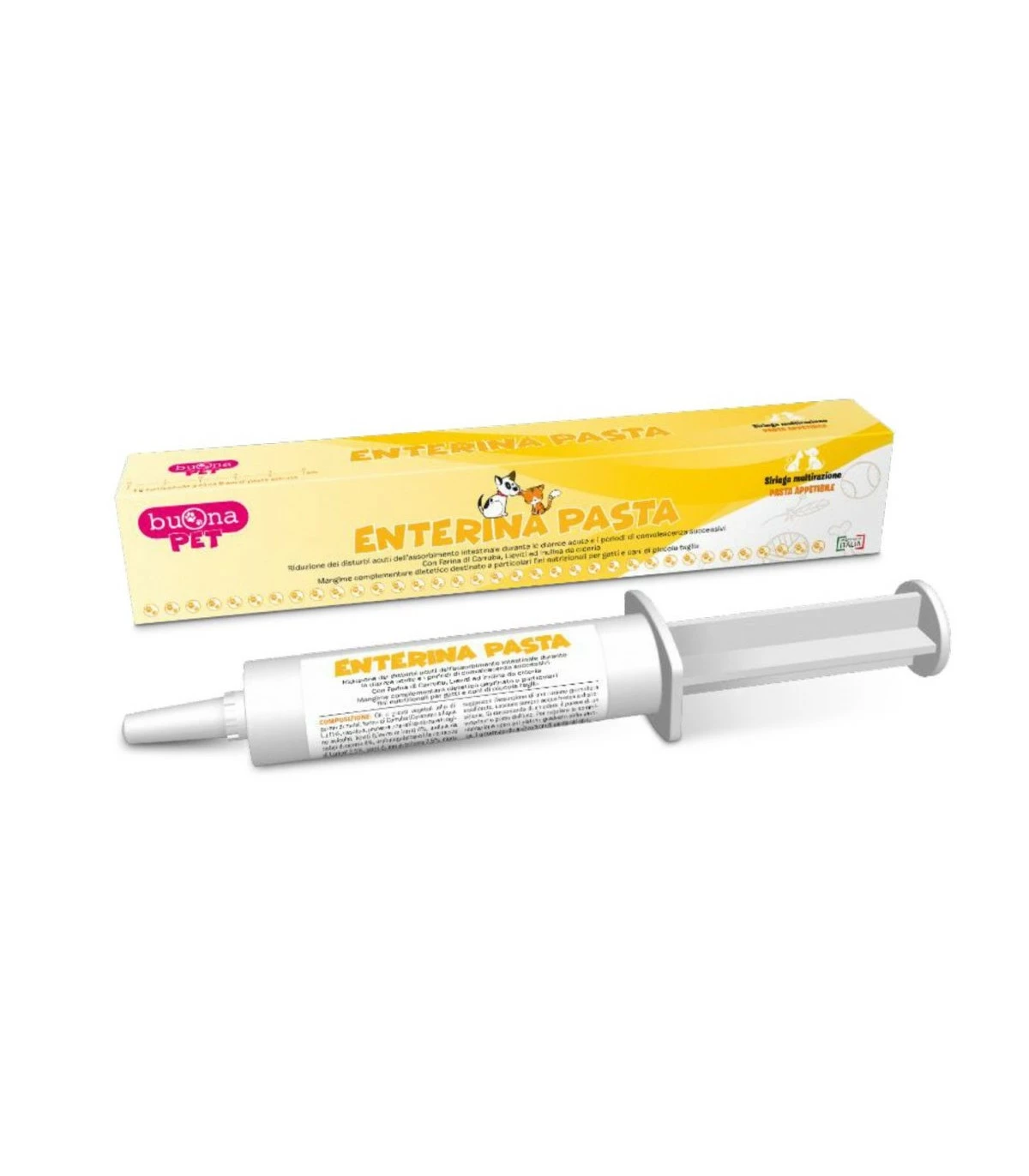ENTERINA PASTA è formulata appositamente in pasta appetibile per gatti, cani di piccola taglia e cani di taglia toy; con un accresciuto livello di elettroliti, farina di Carruba, lieviti (Lievito di birra), Inulina da radici di cicoria ed ingredienti ad elevata digeribilità.