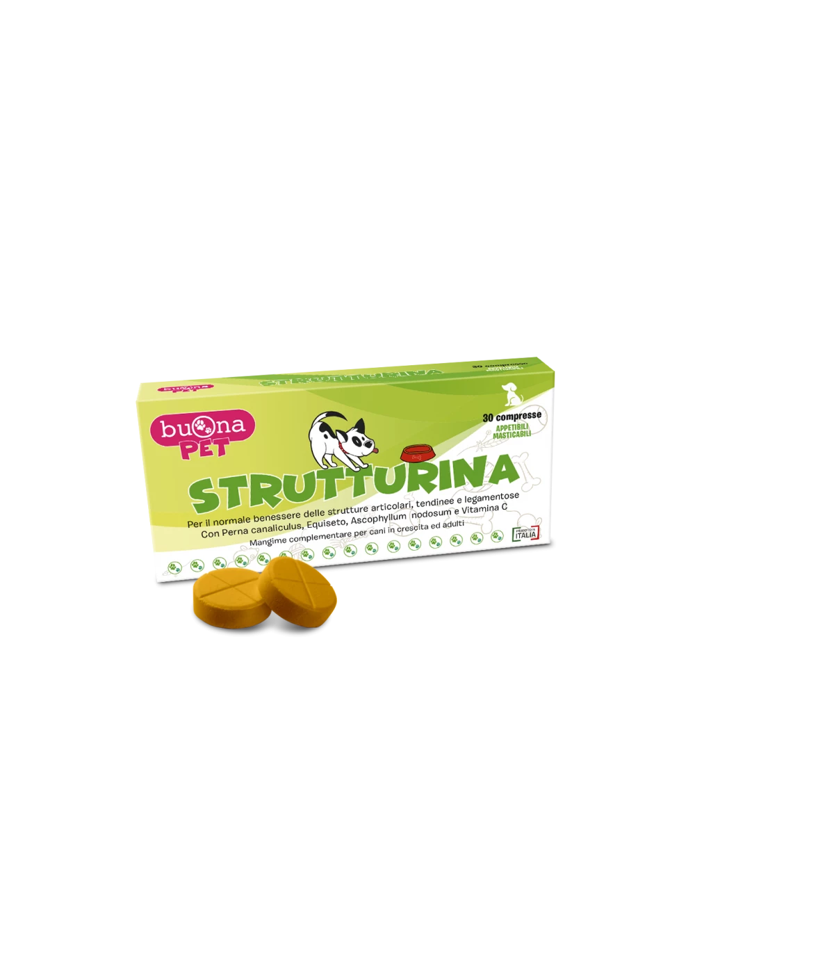 STRUTTURINA è un mangime complementare per cani in crescita ed adulti, formulato in compresse appetibili masticabili; ricco in Perna canaliculus, con Equiseto, alga Ascophyllum nodosum e Vitamina C è utile per favorire il normale benessere delle strutture articolari, tendinee e legamentose.