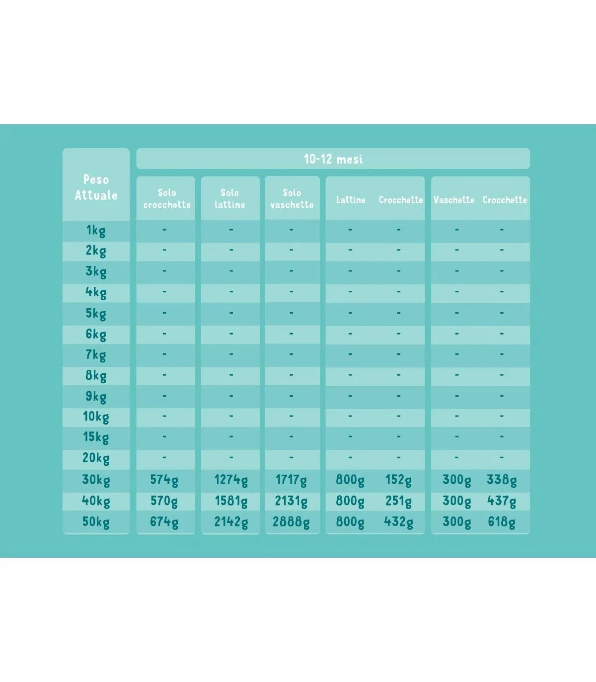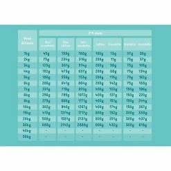 Vedi tabelle nelle immagini. Troverai indicazioni di dosaggio per cuccioli da 0 a 12 mesi d’età .