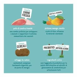 Questa ricetta senza cereali è realizzata con tanta carne fresca di pollo e anatra allevati a terra ed è pensata per soddisfare i bisogni nutritivi dei cani cuccioli in crescita.