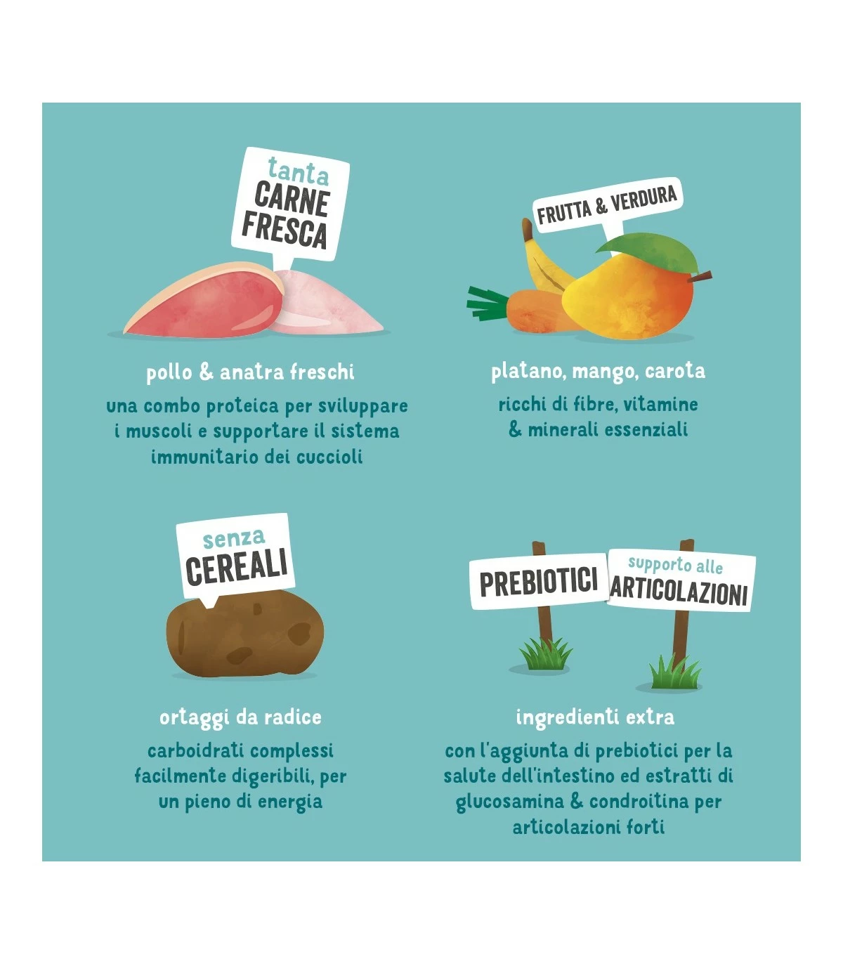 pollo fresco 40%, patate 20%, anatra fresca 10%, piselli 8%, proteina di piselli, proteina di patate, sughetto di pollo, semi di lino, grasso di pollame, minerali, olio di pesce, zucca 0,25%, platano 0,25%, mango 0,25%, mannanoligosaccaridi (MOS), cicoria, erbe 0,2% (fiori di calendula, ortica, foglie di rovo, finocchio, cumino dei prati, camomilla, melissa), carote 0,13%, mirtilli rossi comuni 0,13%, glucosamina, solfato di condroitina.Â